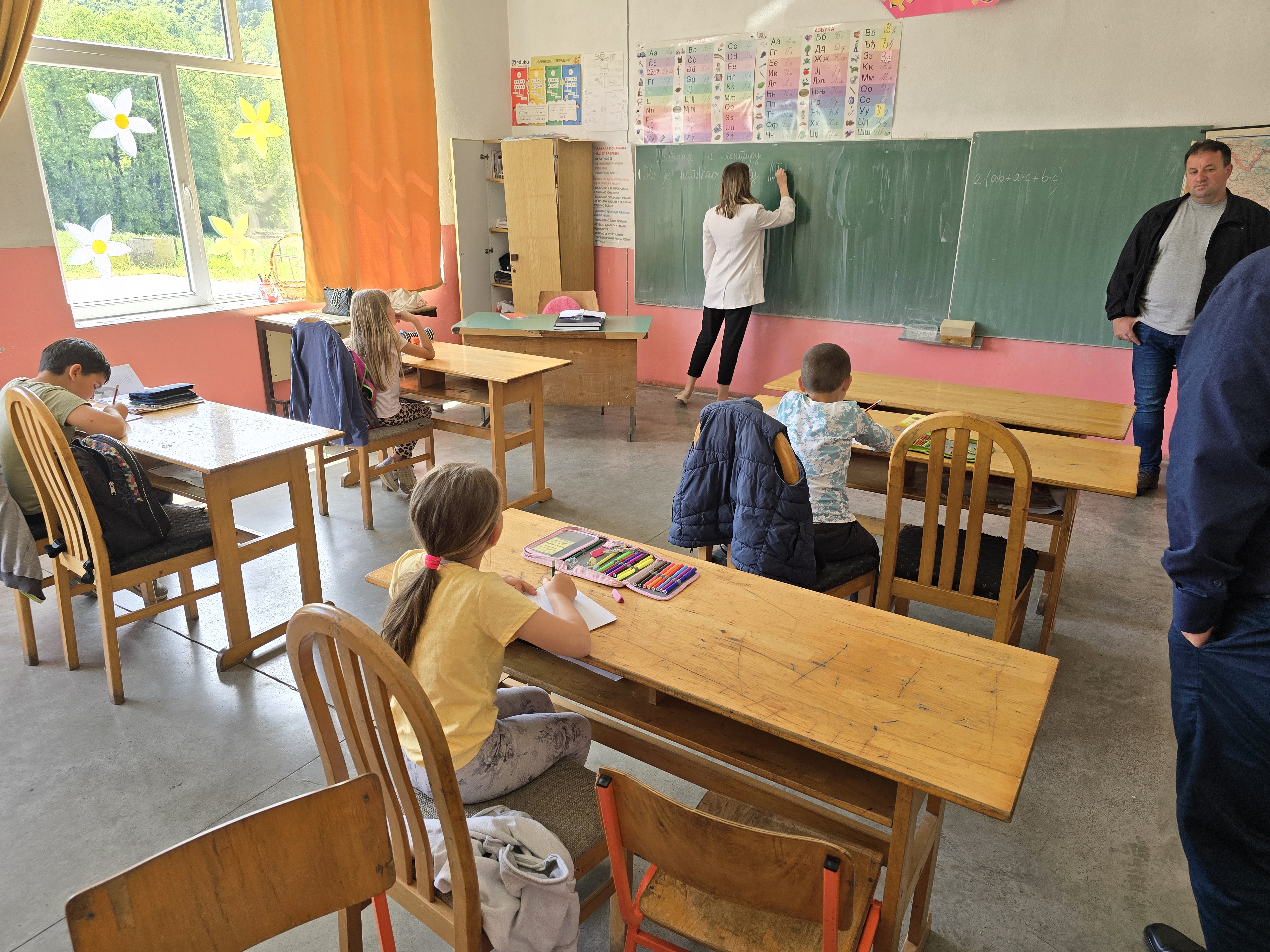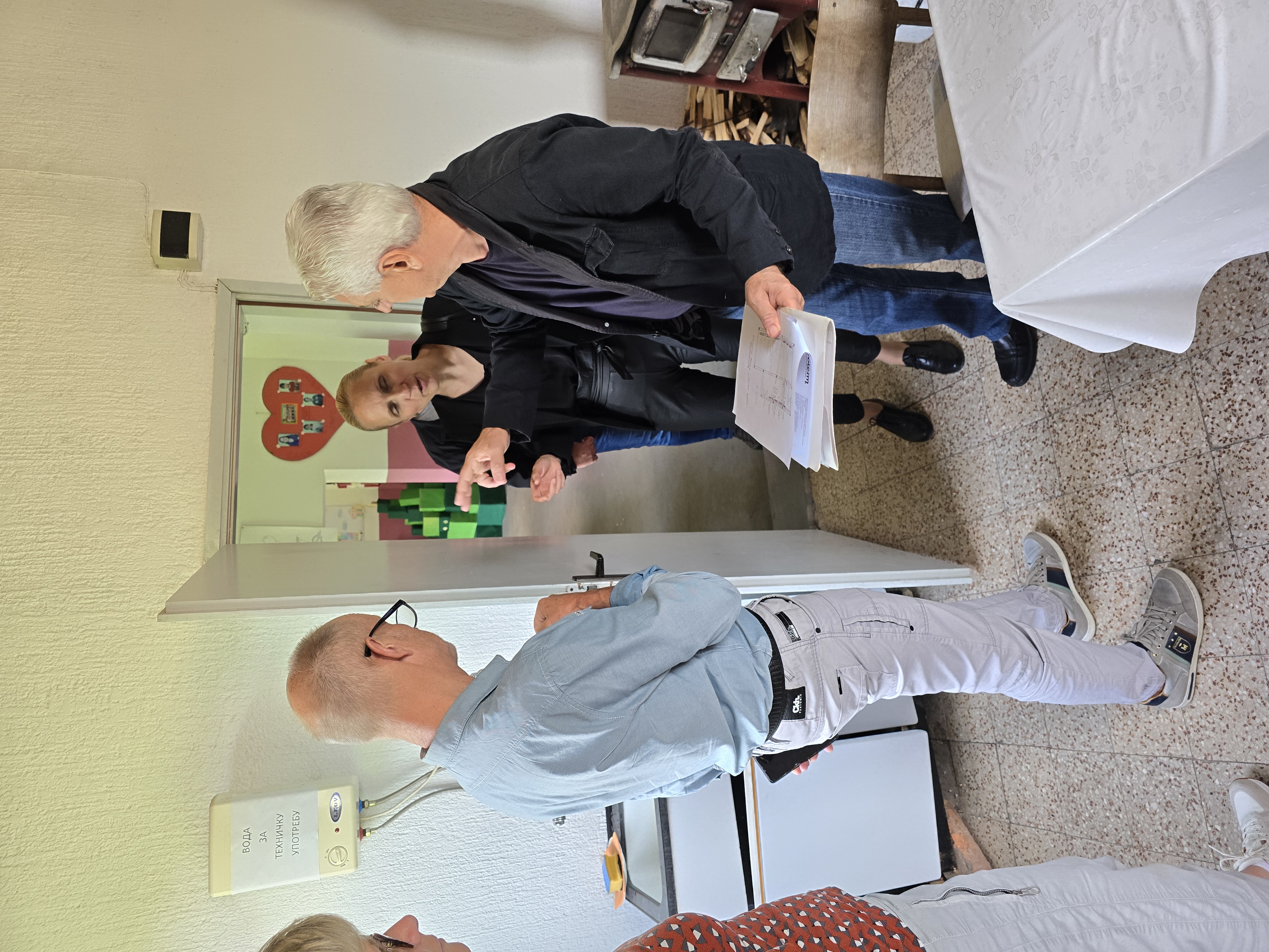 Om 9.00 uur worden we door Indira, Stanislav, Vaso en Vencislav op gehaald bij het hotel. We gaan de school in Jalanjska bezoeken. Aleksandar is daar de directeur. Het is een klein schooltje waar in 2023 een pelletketel geïnstalleerd is. We worden hartelijk ontvangen door Aleksandar en zijn collega's. We bekijken de nieuwe ketel en krijgen weer eten en drinken aangeboden. De kinderen bieden ons een schilderij aan die hun tekenleraar en wat kinderen zelf hebben geschilderd. Willem wordt gevraagd om voor de schooltelevisie een woordje te zeggen. Waar hij vandaan komt en wat zijn missie is, hij legt in het kort uit wat de stichting op de school gedaan heeft.
