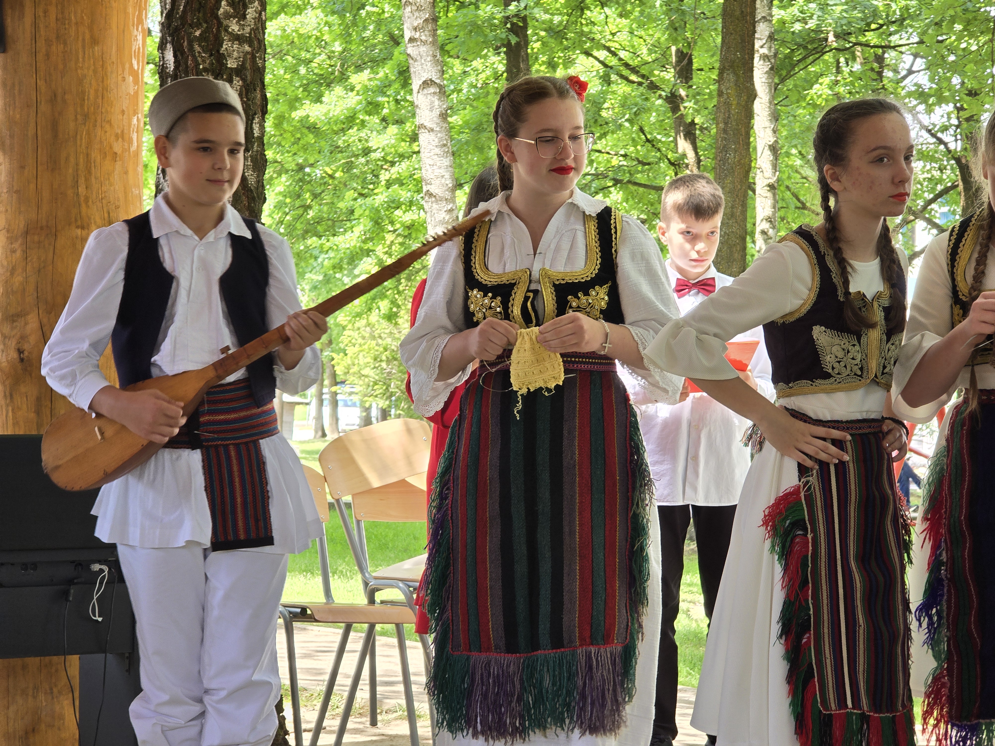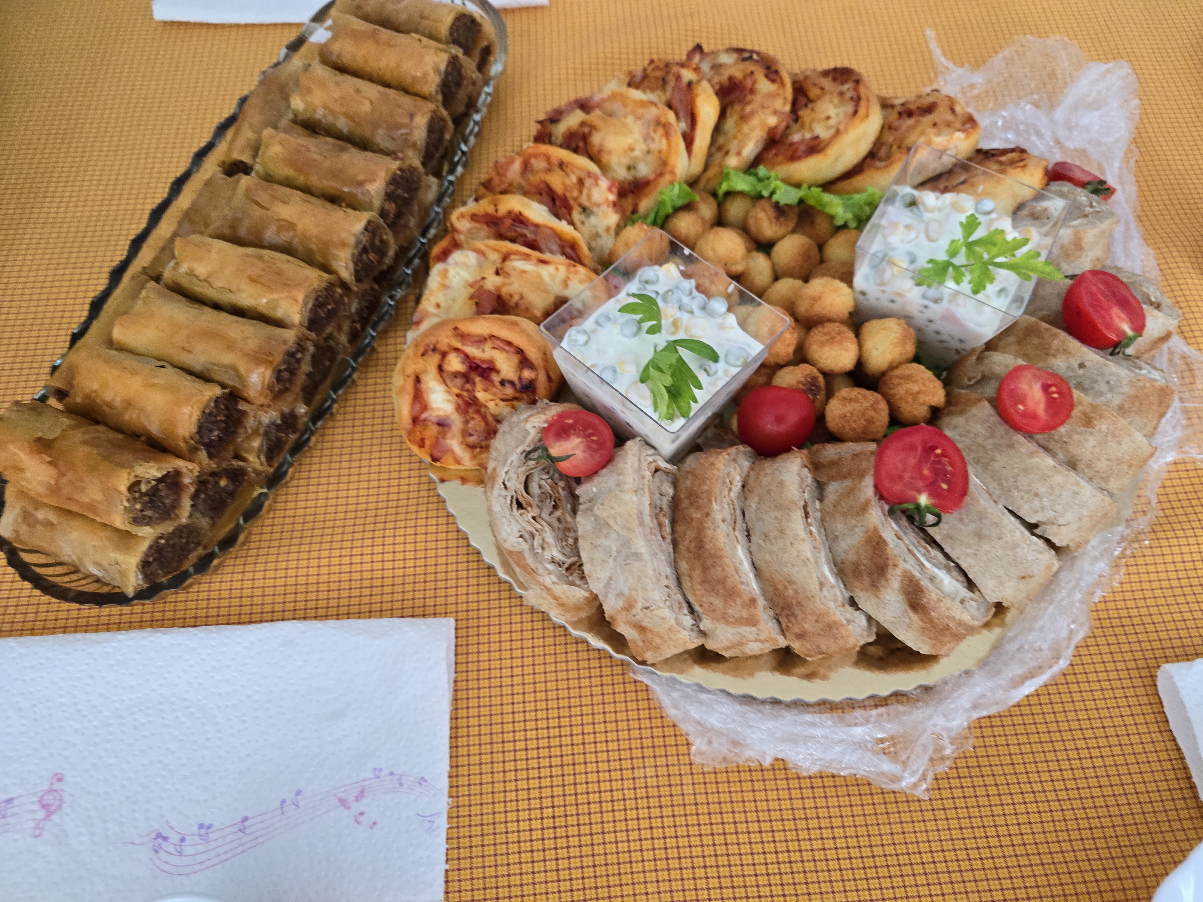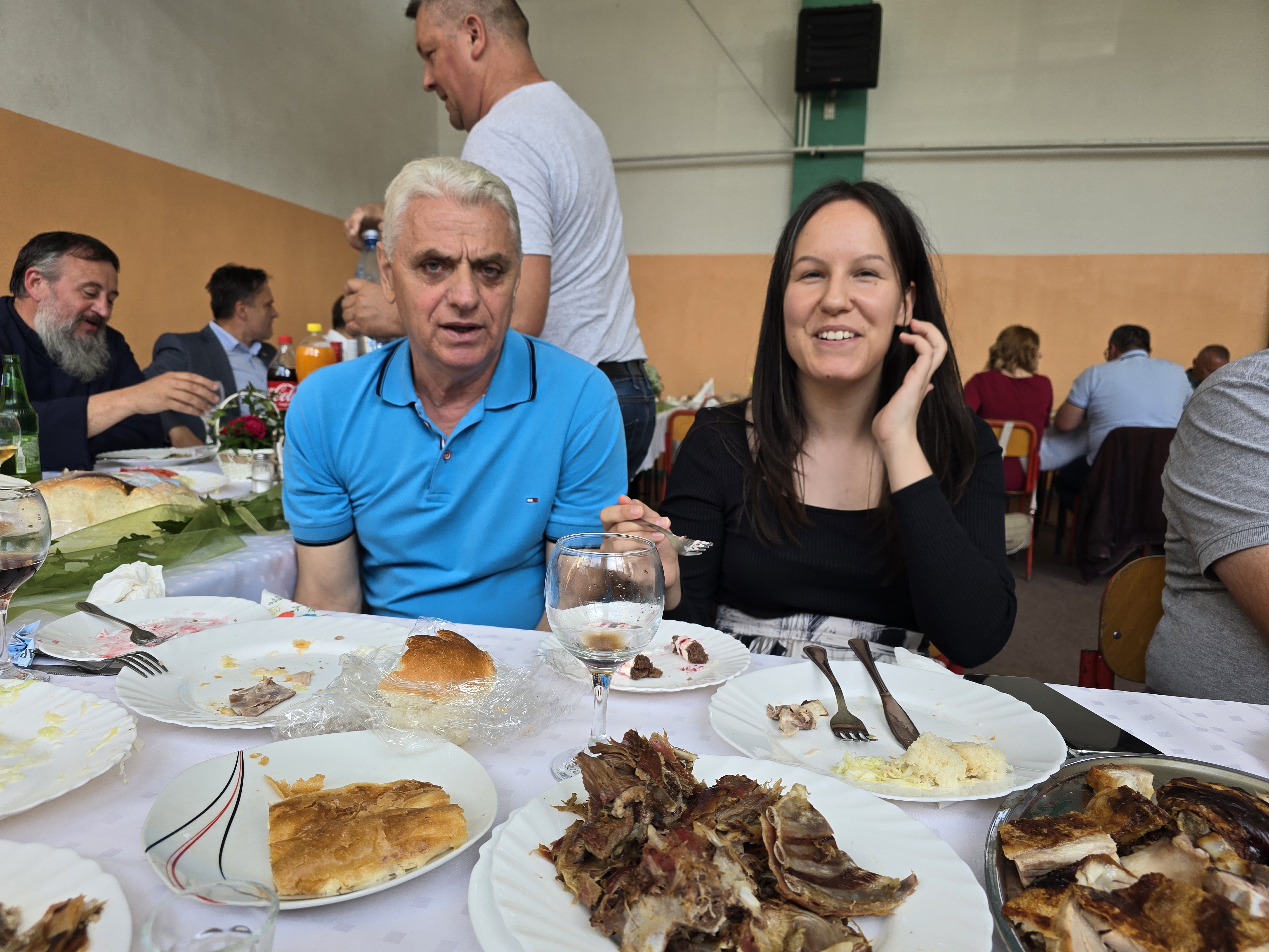 We worden om 11.15 uur opgehaald door Vaso en Vencislav, zij brengen ons naar de school in Stanari. Dat is een prima school, daar hoeft de stichting niet te helpen. Aleksandar is daar de directeur en hij en Zorica, zijn medewerkster, hebben ons uitgenodigd om vandaag het schoolfeest mee te maken. De school is gesloten omdat het een feestdag is, maar een groep kinderen voert een toneelstukje op, weer anderen zingen en dansen. Er zijn in Bosnië veel kinderen die traditionele dansen leren. Na de voorstelling gaan we naar de gymzaal, daar staan heel veel tafels klaar die mooi gedekt zijn en er is weer heel veel eten. Er zijn veel mensen van gemeentelijke instellingen, de burgermeester is er en er zijn geestelijken, leerkrachten en wij zijn ook uitgenodigd om aan de lunch deel te nemen. Er is zelfgemaakte goulashsoep en schalen met vlees, broodjes en rauwkost. Er is sterke drank en natuurlijk kan de slivovitsj niet ontbreken. Als toetje is er heerlijke taart. We nemen afscheid van Aleksandar en Zorica Vesna, lerares Engels,