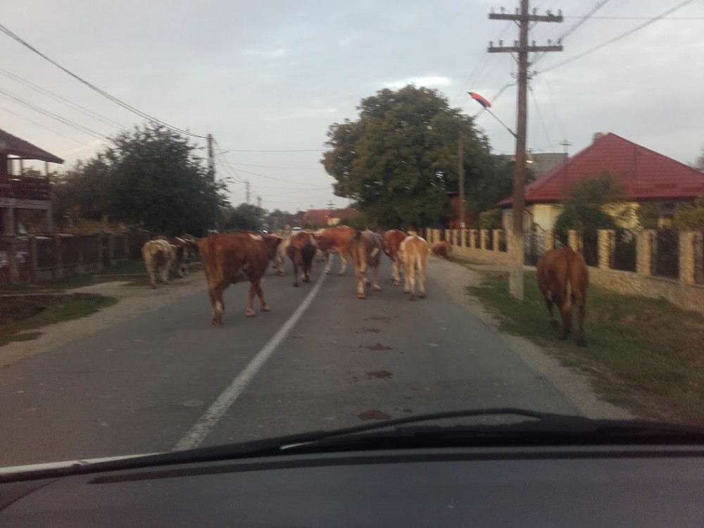 De tocht vanaf ons pension in Bârsana, met zijn schitterende houten klooster en kerk (zoek een keer op Bârsana Maramures) naar Borleasa voerde ons door echt een prachtig stuk Roemenië. Heuvels, dalen, kleine dorpjes en veel uitgestrekte bossen. Vroeg in de morgen sturen de Roemenen hun koeien vanuit de achtertuin naar buiten. De beesten verzamelen zich en gaan onder leiding van een herder de hele dag in de weide omgeving grazen. De bovenstaande foto is gemaakt op een doorgaande verkeersader. Rustig wachten tot de dames het dorp uit zijn en dan kan de reis weer verder.