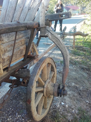 Onderweg kom je hier nog gewoon houten wagens tegen met paard, of koeien of ossen ervoor. Hieronder een foto van de ‘ophanging’ van een plaatselijk Roemeens transportmiddel. De bruine beer en de wolf zijn in Roemenië nog veelvuldig te vinden.