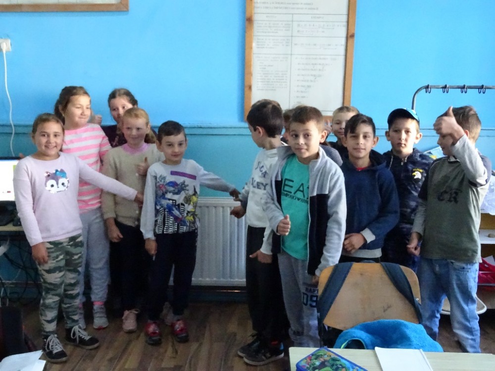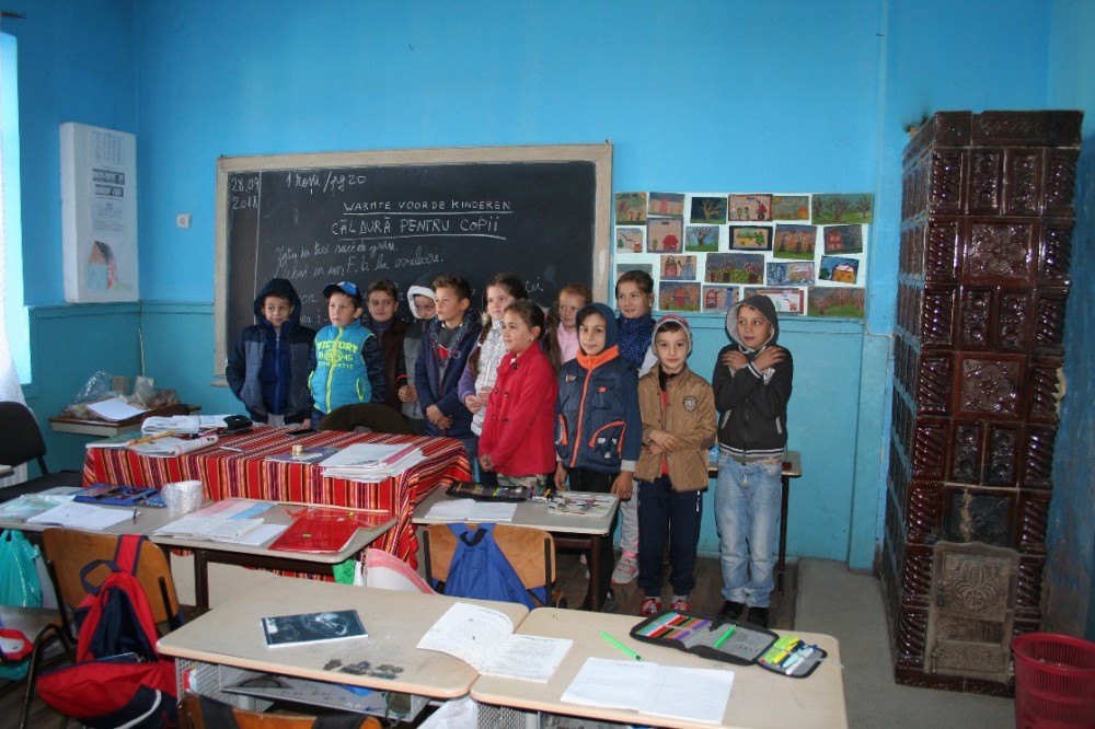 De kinderen hebben hier jassen aan om aan te geven dat ze het in de winter koud hebben in de klas. Roemeense winters kennen temperaturen van -30 graden. Rechts staat een Terracotta. Deze houtgestookte kachel gaat vaak stuk. De kinderen voorin de klas smelten en de kinderen achterin hebben het steenkoud. Hier staan de kinderen ‘zonder jas’ bij de radiatoren. Ze zijn blij dat deze winter de kou buiten de school blijft door de nieuwe installatie.