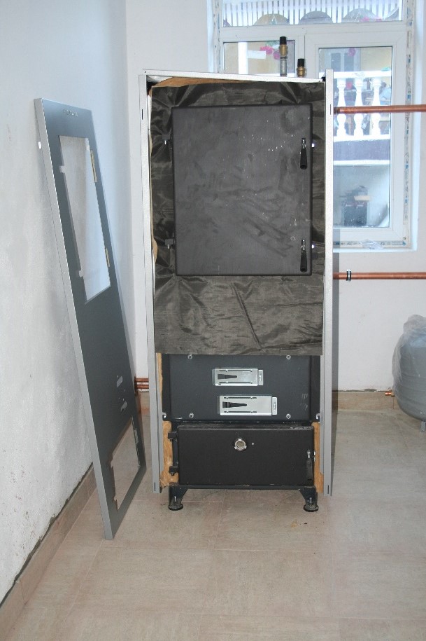 Links hieronder de houtgestookte CV-ketel. Men heeft geen gas in het dorp maar stookt (eiken) hout. Een thermostaat tempert de zuurstoftoevoer als de installatie de juiste temperatuur heeft bereikt. Rechts het verdeelstuk met pomp. Men was nog druk met de aanleg van de installatie toen wij er waren.